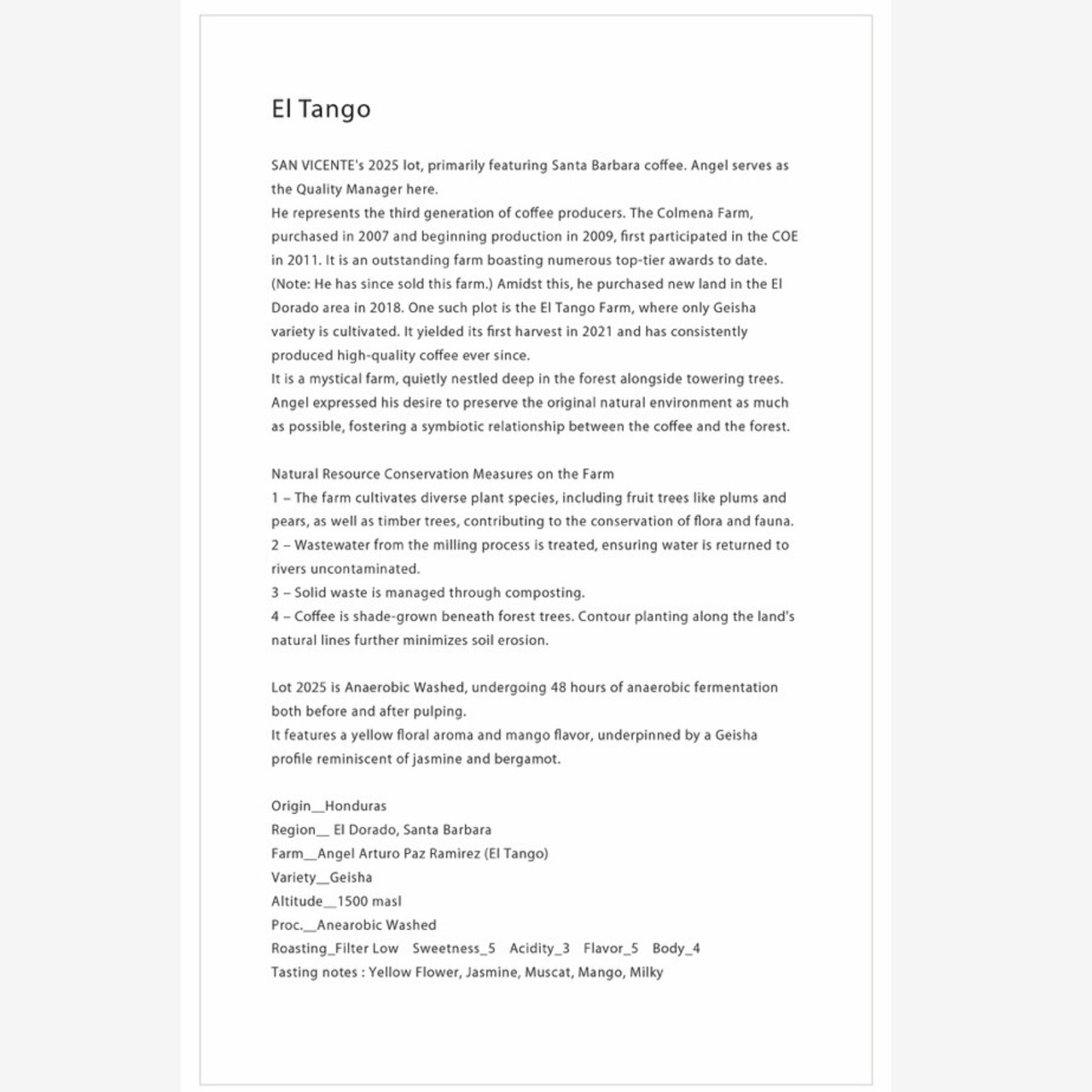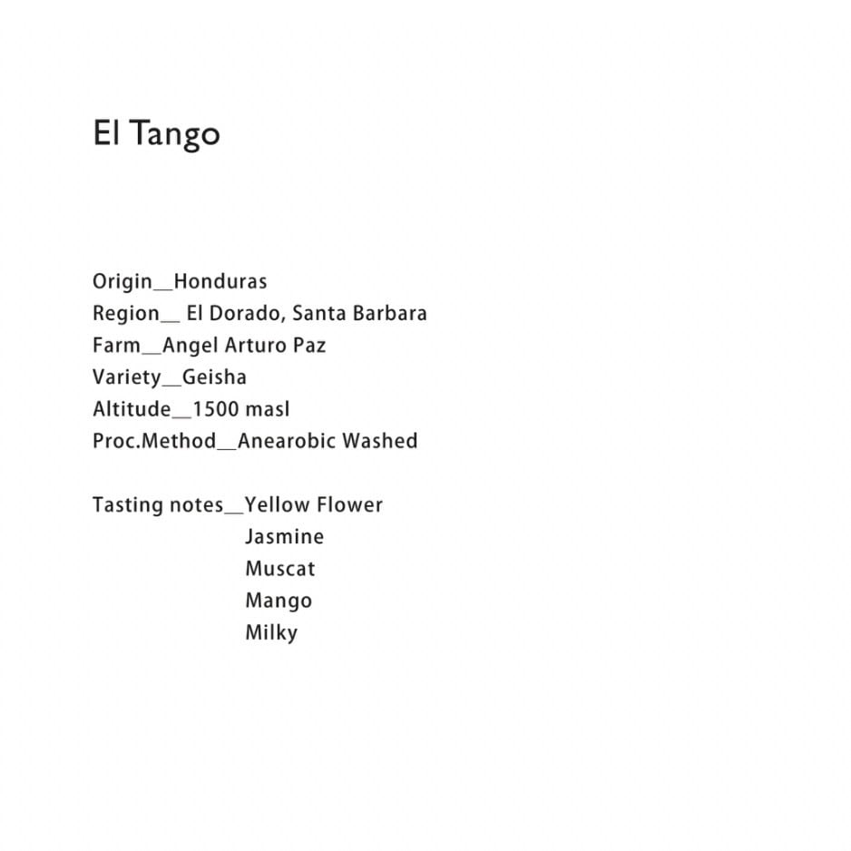 He represents the third generation of coffee producers. The Colmena Farm, purchased in 2007 and beginning production in 2009, first participated in the COE in 2011. It is an outstanding farm boasting numerous top-tier awards to date. (Note: He has since sold this farm.) Amidst this, he purchased new land in the El Dorado area in 2018. One such plot is the El Tango Farm, where only Geisha variety is cultivated. It yielded its first harvest in 2021 and has consistently produced high-quality coffee ever since.