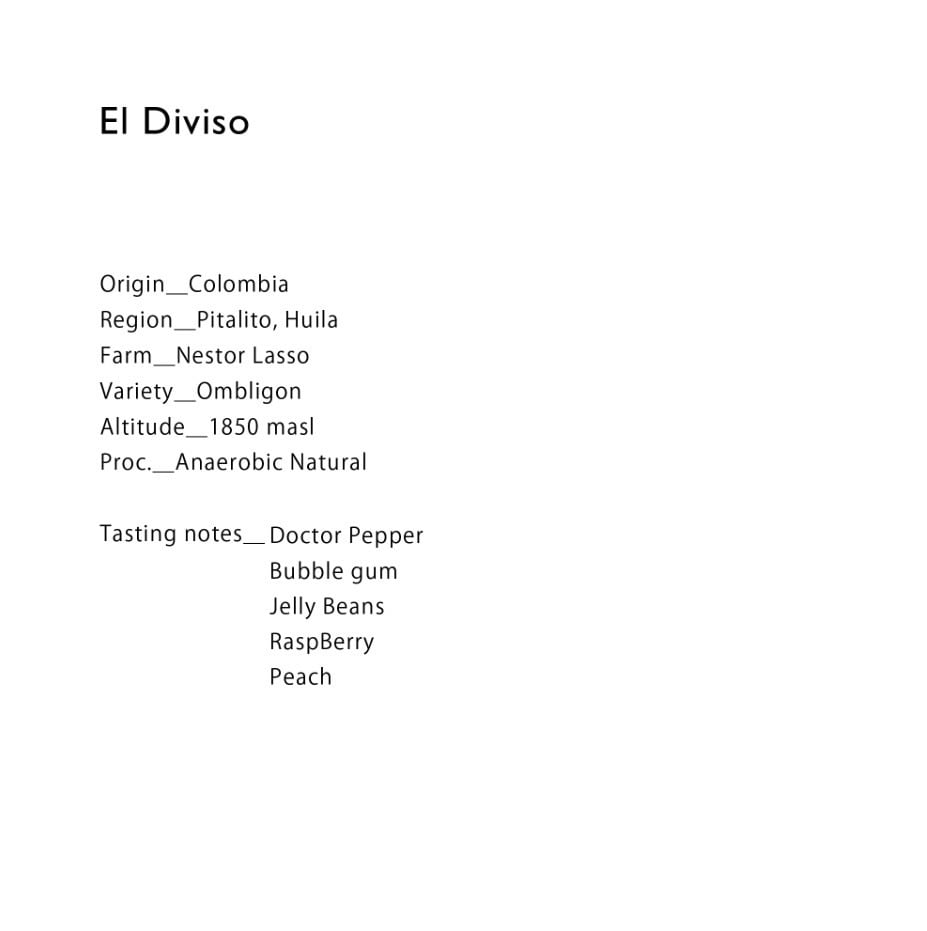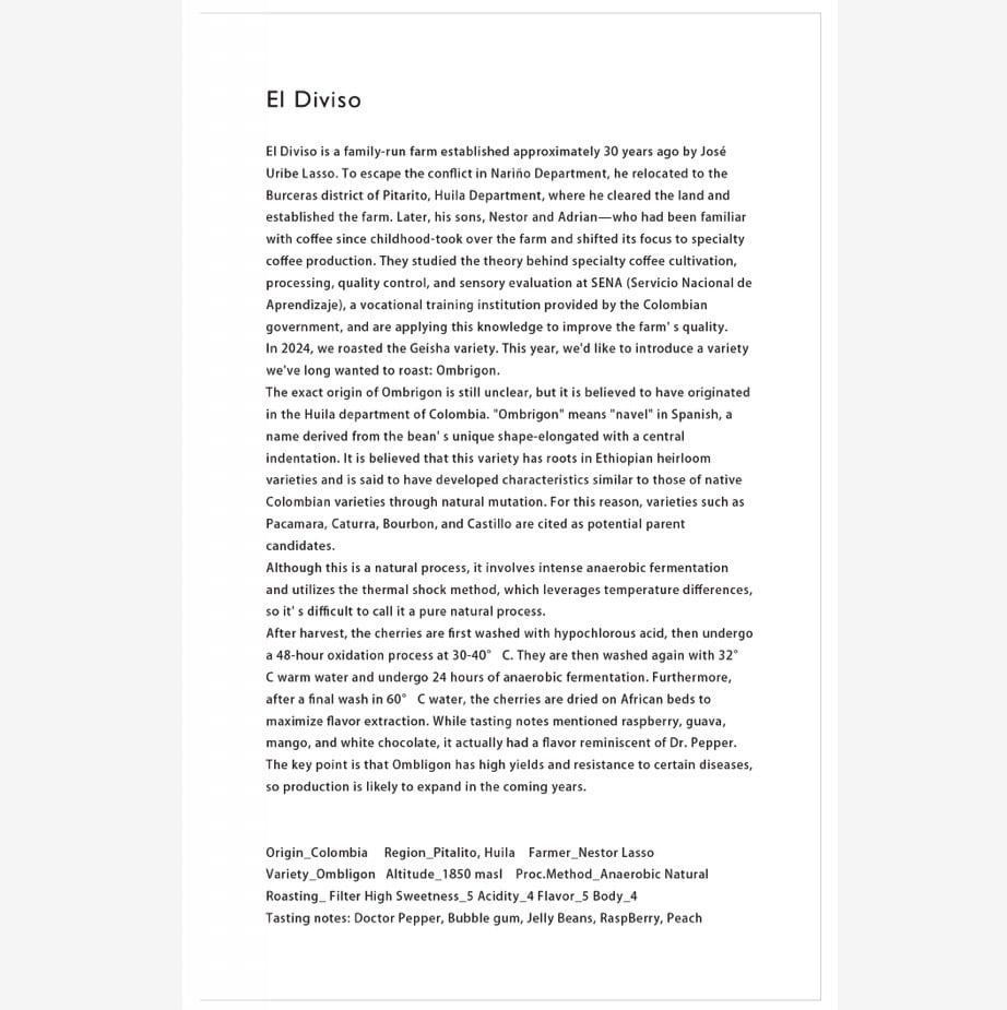 El Diviso is a family-run farm established approximately 30 years ago by José Uribe Lasso. To escape the conflict in Nariño Department, he relocated to the Burceras district of Pitarito, Huila Department, where he cleared the land and established the farm. Later, his sons, Nestor and Adrian—who had been familiar with coffee since childhood-took over the farm and shifted its focus to specialty coffee production. They studied the theory behind specialty coffee cultivation, processing, quality control, and sensory evaluation at SENA (Servicio Nacional de Aprendizaje), a vocational training institution provided by the Colombian government, and are applying this knowledge to improve the farm' s quality.